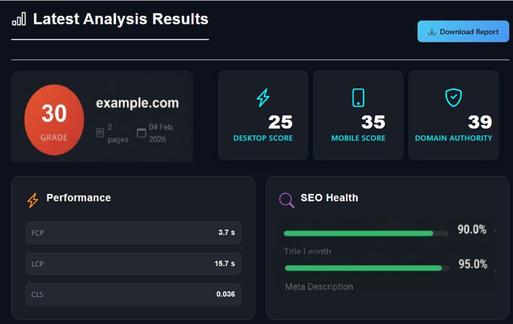 Our analyzer delivers a comprehensive report with prioritized fixes so you can act quickly to improve site-wide search engine visibility and user experience.